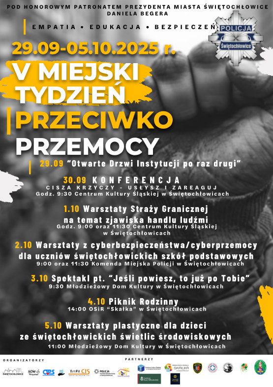 W ramach programu przygotowano szereg wydarzeń. 29 września odbędą się Otwarte Drzwi Instytucji, 30 września w Centrum Kultury Śląskiej zaplanowano konferencję „Cisza krzyczy – usłysz, zareaguj”. 1 października w tym samym miejscu odbędą się warsztaty Straży Granicznej dotyczące handlu ludźmi, a 2 października w Komendzie Miejskiej Policji przewidziano zajęcia z cyberbezpieczeństwa i cyberprzemocy dla uczniów świętochłowickich szkół podstawowych.