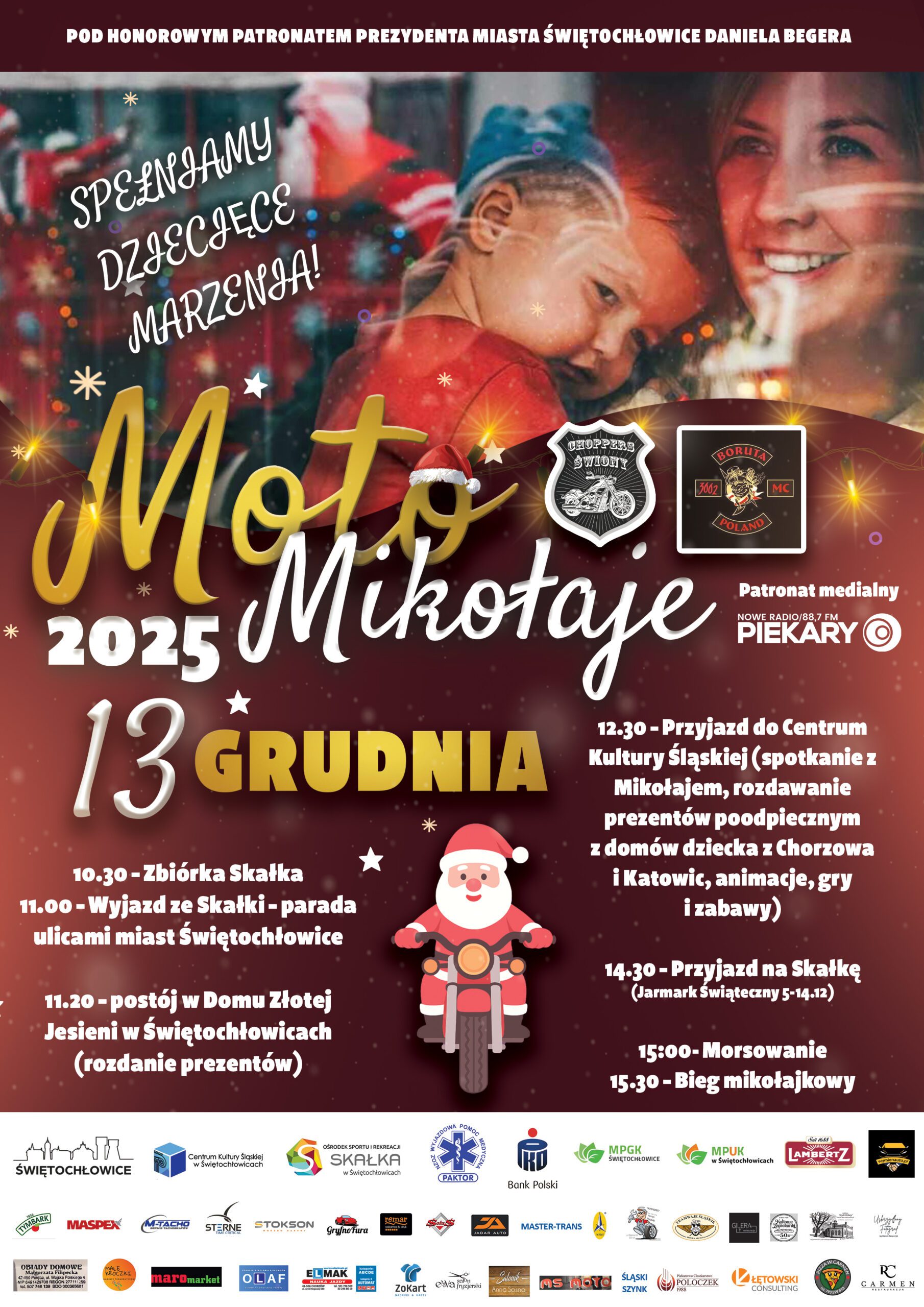 Po zakończeniu wizyt charytatywnych uczestnicy i mieszkańcy powrócą na Skałkę o godzinie 14:30, gdzie w ramach trwającego Jarmarku Świątecznego czekają kolejne atrakcje. O 15:00 odbędzie się morsowanie – pokaz odwagi i hart ducha, podczas którego odważni Morsowie zmierzą się z zimowym chłodem. Następnie o 15:30 zaplanowano Bieg Mikołajkowy, będący sportowym akcentem kończącym dzień, idealnym dla tych, którzy chcą aktywnie spędzić czas i spalić świąteczne kalorie w towarzystwie innych uczestników. To wyjątkowe wydarzenie łączące pasję do motocykli z pomaganiem innym. To nie tylko radosna parada, ale przede wszystkim okazja do wspólnego działania na rzecz dzieci i lokalnej społeczności.