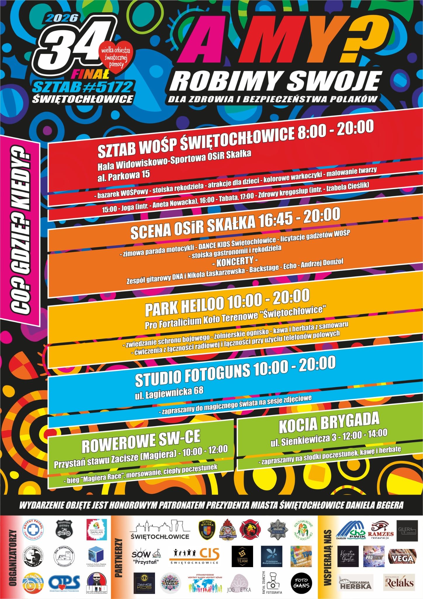 Finał WOŚP w Świętochłowicach odbywa się pod honorowym patronatem Prezydenta Miasta Daniela Begera. Wydarzenie angażuje lokalne instytucje, organizacje społeczne, stowarzyszenia, a także przedsiębiorców, tworząc wyjątkową atmosferę wspólnego działania dla zdrowia i bezpieczeństwa Polaków.
