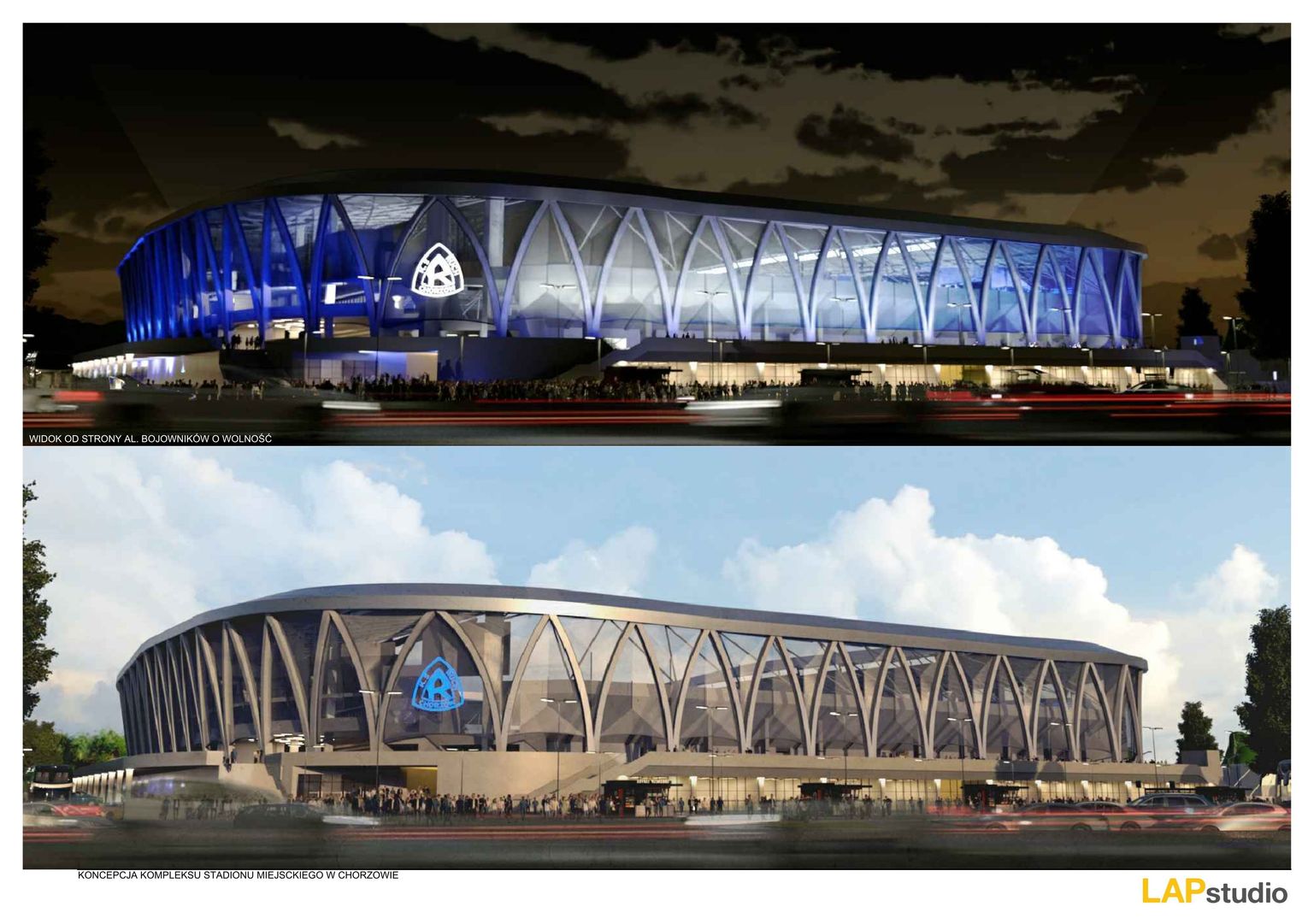 Realizacja kolejnych etapów budowy stadionu zakłada w pierwszej kolejności powstanie trybuny od strony Alei Bojowników o Wolność i Demokrację, gdzie znajdzie się główne wejście oraz przestrzenie komercyjne pod wynajem, a przyległy plac posłuży organizacji imprez masowych lub lodowiska. W finałowej fazie inwestycji przewidziano budowę trybuny wzdłuż boiska na 8 tysięcy miejsc oraz ostatniego sektora za bramką od strony hali sportowej, co domknie bryłę obiektu. Nowoczesny stadion, spełniający wymogi III kategorii UEFA, zostanie wyposażony w przeszklony dach z zintegrowanym oświetleniem, a jego ażurowa, podświetlana fasada nawiąże kształtem do herbu Ruchu Chorzów. Całość uzupełni bogate zaplecze użytkowe, w tym muzeum klubu, restauracja, siłownia oraz sala zabaw, umożliwiając organizację rozgrywek na szczeblu krajowym i międzynarodowym.