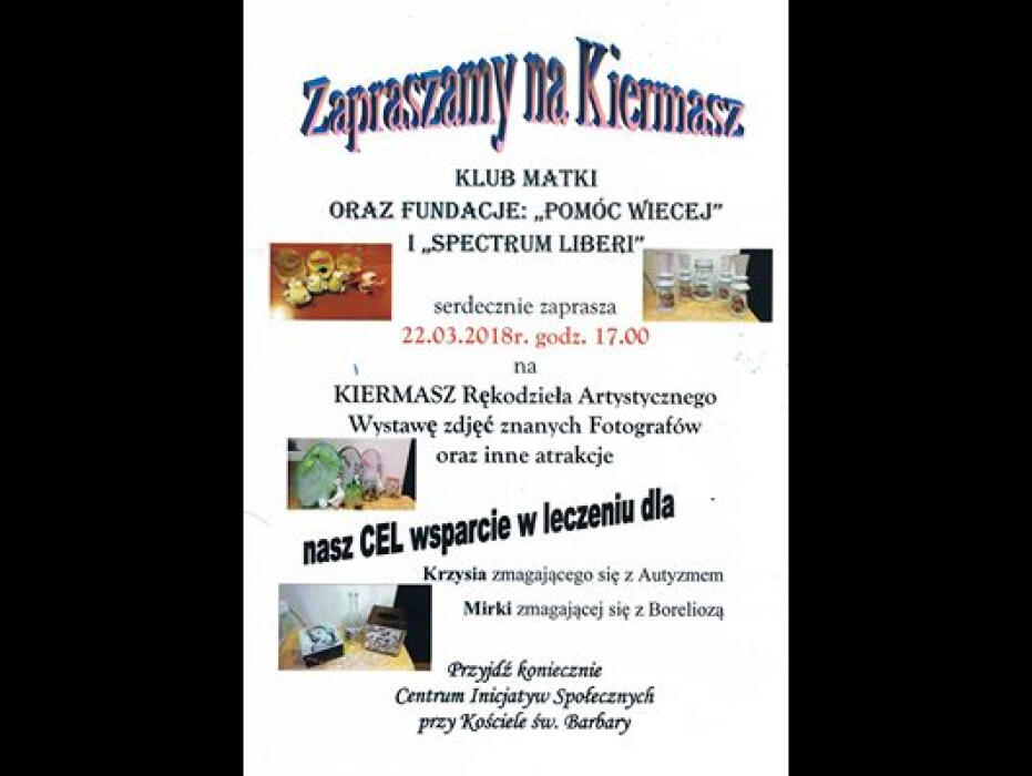 Kiermasz odbędzie się w Centrum Inicjatyw Społecznych, które mieści się przy Kościele św. Barbary (ul. 3 maja 18). Wraz z kiermaszem zobaczymy wystawę zdjęć znanych fotografów oraz wiele innych atrakcji. Celem jest wsparcie Krzysia zmagającego się z autyzmem oraz Mirki zmagającej się z Boreliozą.