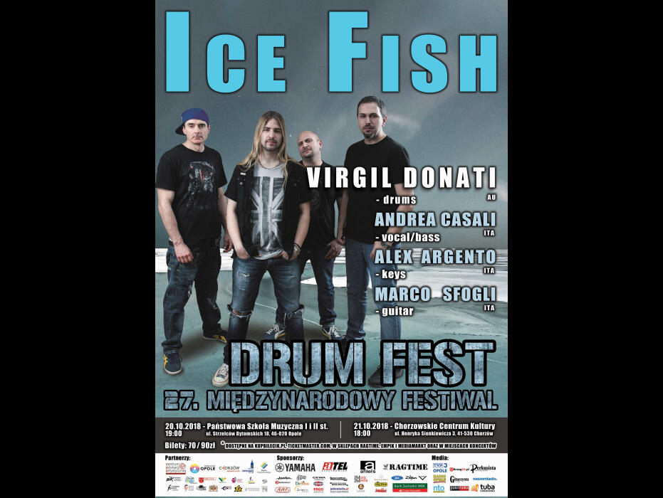 Dwa wspaniałe koncerty, zespołów z rewelacyjnymi perkusistami w składzie. Pierwszy z nich odbędzie się już w najbliższą niedzielę, 21 października. Na deskach Chorzowskiego Centrum Kultury wystąpi włosko-australijska grupa Ice Fish. Świetna muzyka, z pięknymi melodiami i zawiłymi hard-rockowymi rytmami, wykonywana przez znakomitych muzyków – tak w skrócie można opisać jej twórczość. Formacja gra progresywnego rocka, a w składzie znajduje się gitarzysta Marco Sfogli, klawiszowiec Alex Argneto, basista i wokalista Andrea Casali, a także legendarny perkusista Virgil Donati. Ten ostatni, to wirtuoz swojego instrumentu, który ma na swoim koncie występy z grupą Planet X czy ze Stevem Vaiem.