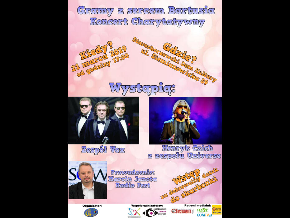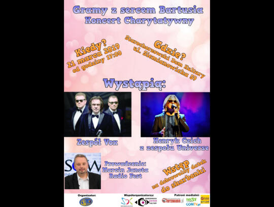 W trakcie imprezy obędą się licytacje, można będzie również kupić maskotki, szkolne gadżety, ciasta oraz kawę i herbatę. Na scenie wystąpią uczniowie II LO im. Juliusza Ligonia w Chorzowie, którego absolwentami są rodzice Bartusia. Koncert uświetni natomiast Henryk Czich z Universe oraz zespół Vox.