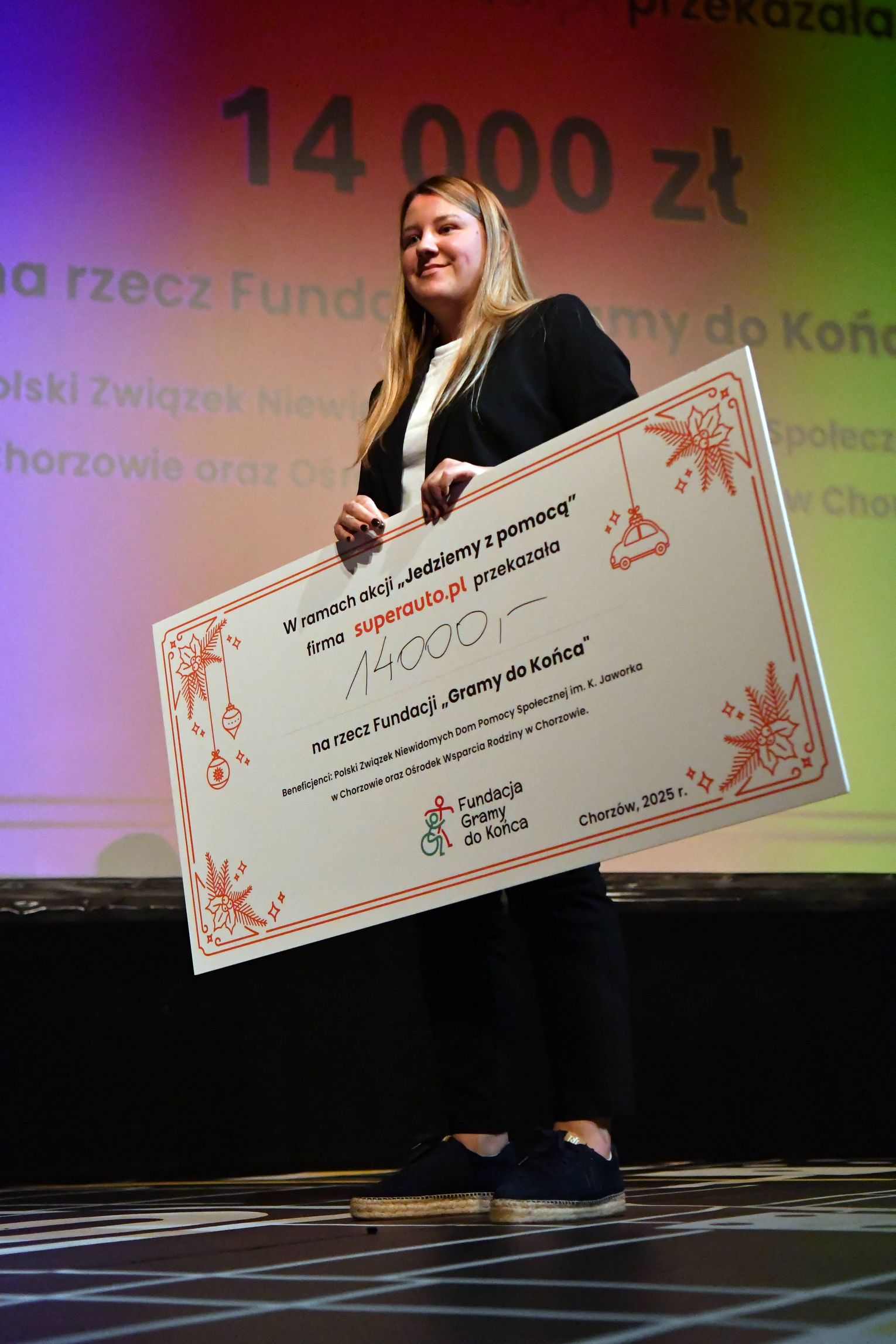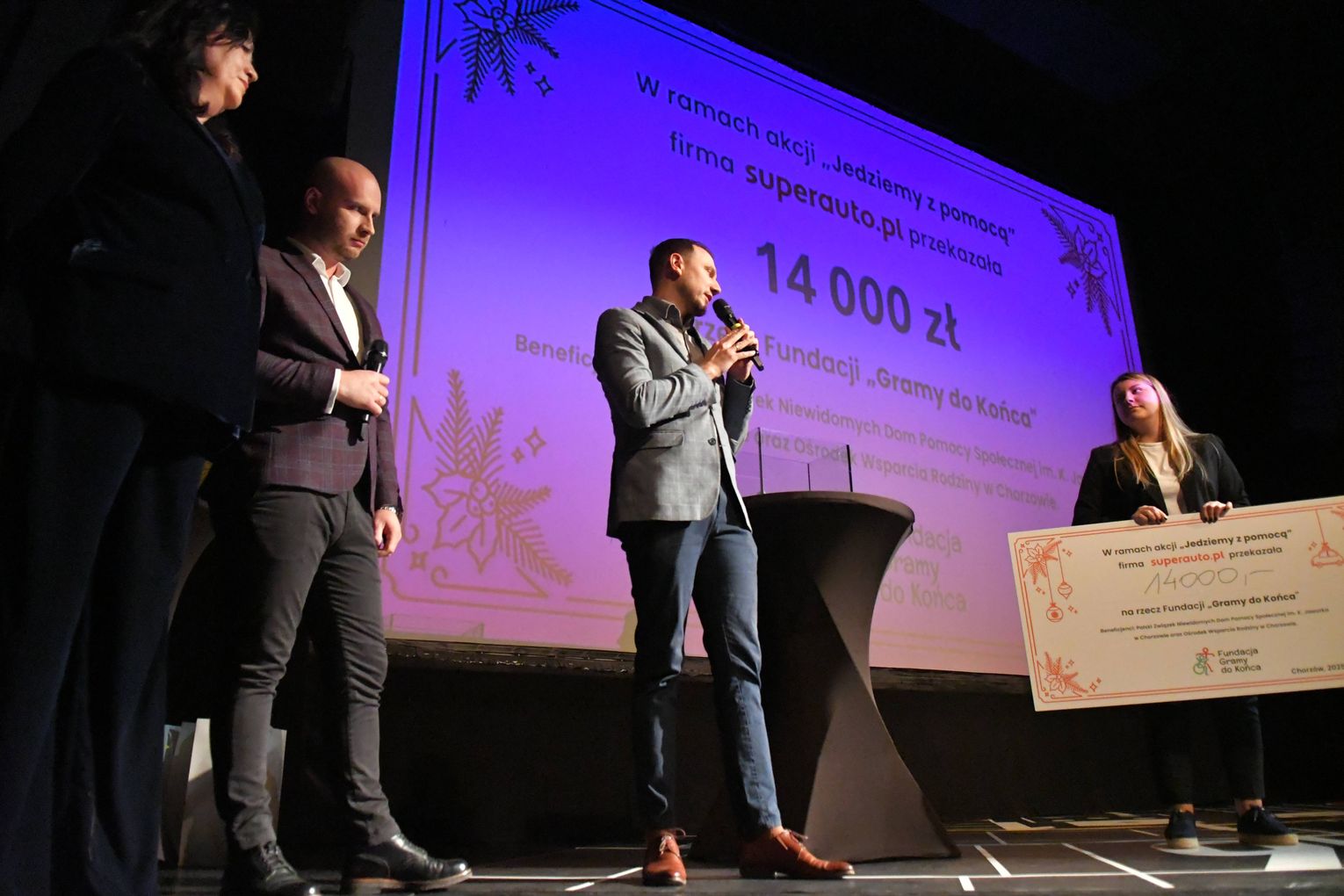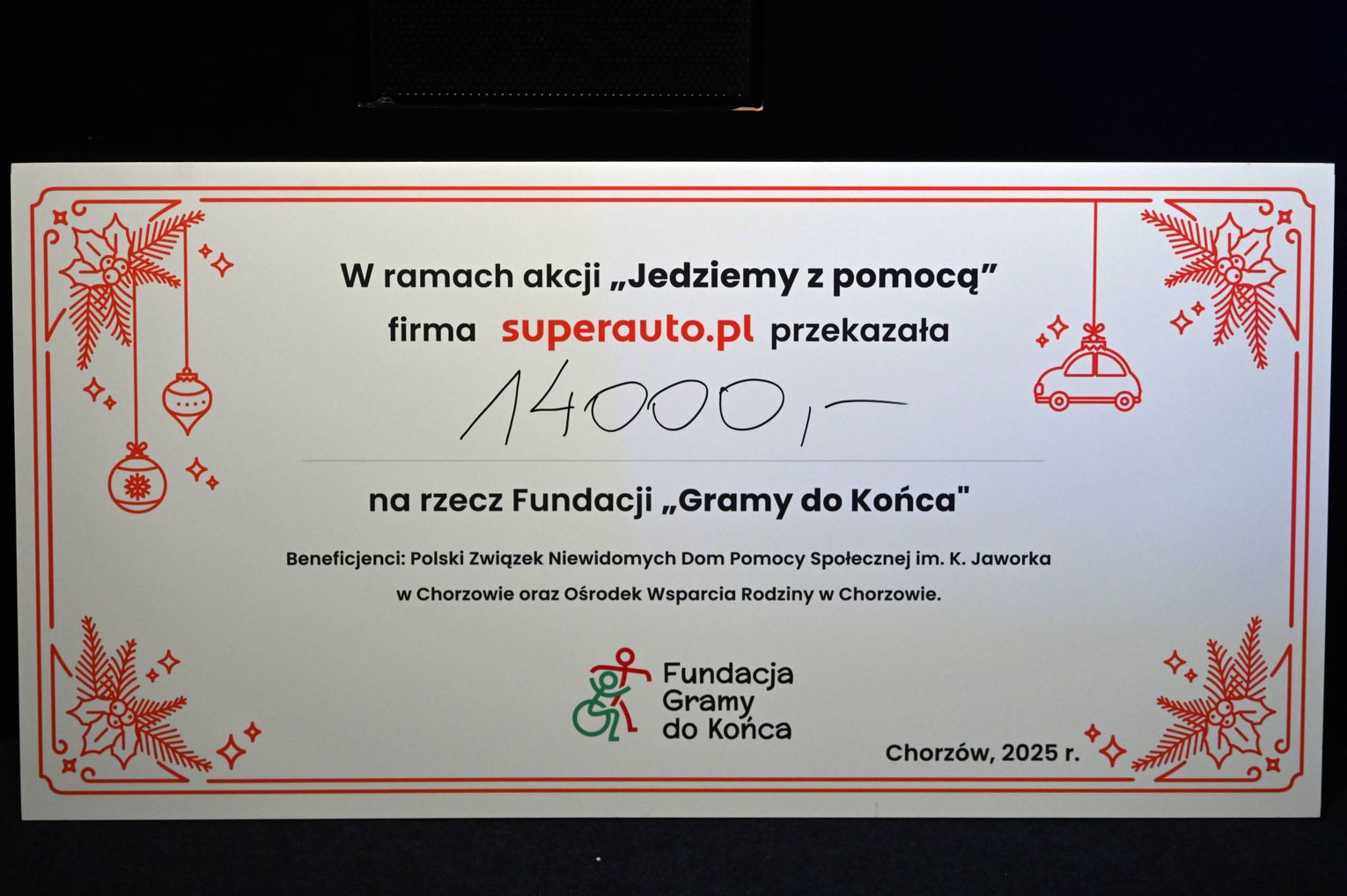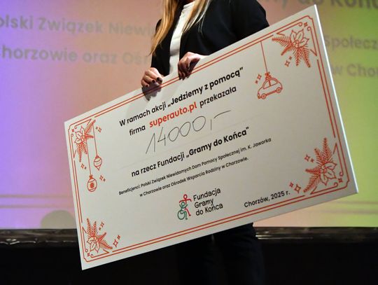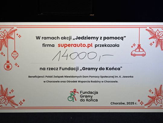 Pracownicy chorzowskiej firmy Superauto.pl, w ramach akcji "Jedziemy z pomocą" zebrali 14 000 zł, które zostały przekazane na ręce prezesa Fundacja Gramy do Końca podczas corocznego spotkania świątecznego.