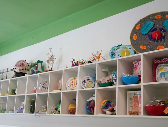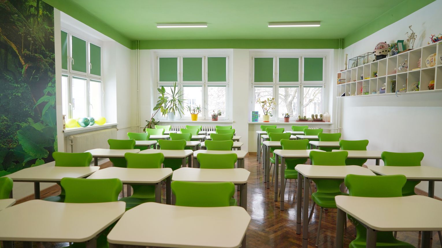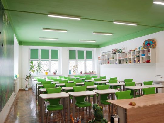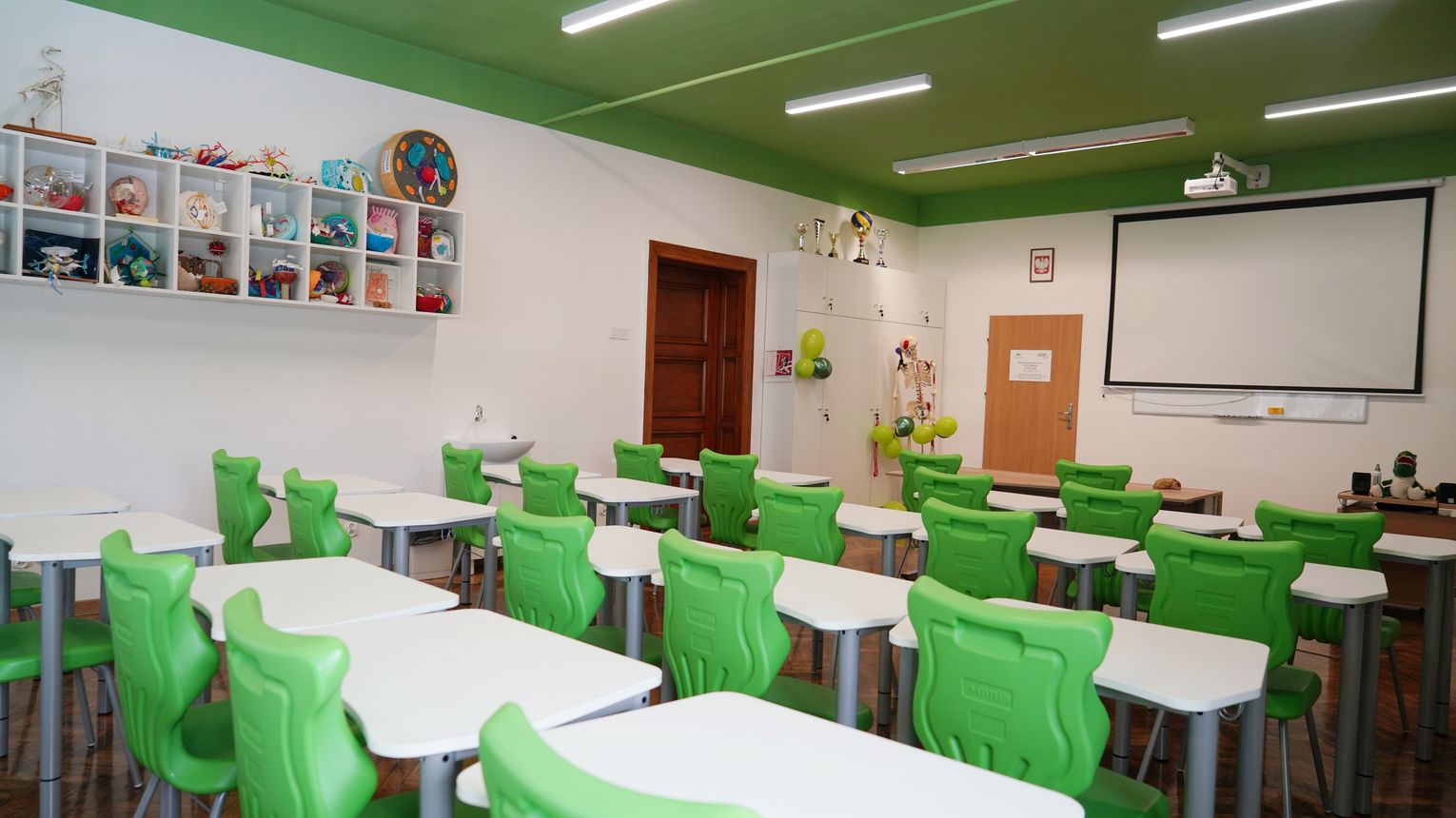 W sali dominuje teraz zielony kolor, w środku znalazły się półki na różnego rodzaju pomoce dydaktyczne, ponadto zakupiono regulowane stoliki, mające ułatwić prace przy mikroskopach, oraz stolik laboratoryjny, na którym będzie można wykonywać doświadczenia ![]()